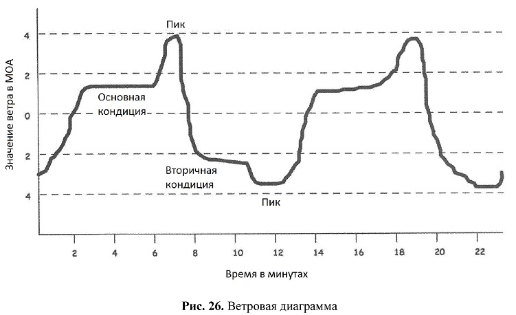 На ветровой диаграмме (рисунок 26) представлен ветер типа «рыбий хвост», который меняется от верхнего пика слева, равного 4 МОА, до нижнего пика справа, равного 3 МОА. Основные кондиции 1 МОА ветра слева, и есть короткие вторичные кондиции ветра справа, равные приблизительно 2 МОА. Один цикл занимает приблизительно 12 минут, а ветер слева дует примерно 8 или 9 минут. Среднее значение близко к нулю, но ветер там не практически задерживается.