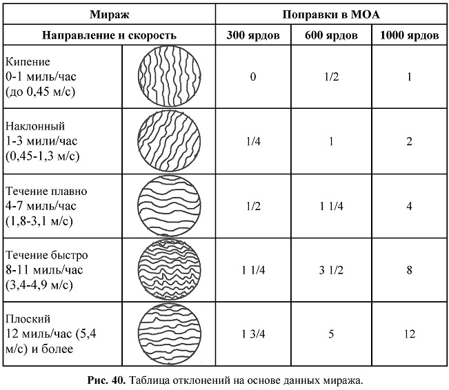 Поскольку мираж является настолько превосходным инструментом для оценки слабого ветра (и ветра типа «рыбий хвост»), некоторые стрелки не понимают, какое значение ветра он может эффективно отображать. Первый раз, когда мы сопоставили эти таблицы, мы были удивлены, как много ветра мы смогли прочитать по миражу. На 1000 ярдов у нас могло легко быть больше 10 МОА поправок, и мы все еще читали мираж!