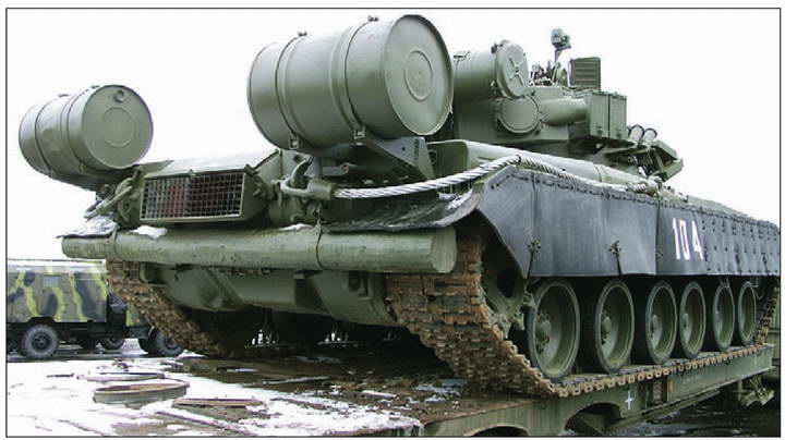 Показана установка средней бочки на танке Т-80Б, однако бочки не подключены к топливной системе