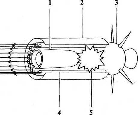 Схема рентгеновского лазера: 1. Следящий телескоп. 2. Кожух. 3. Наведение и двигательная установка. 4. Лазерные стержни. 5. Ядерная бомба.