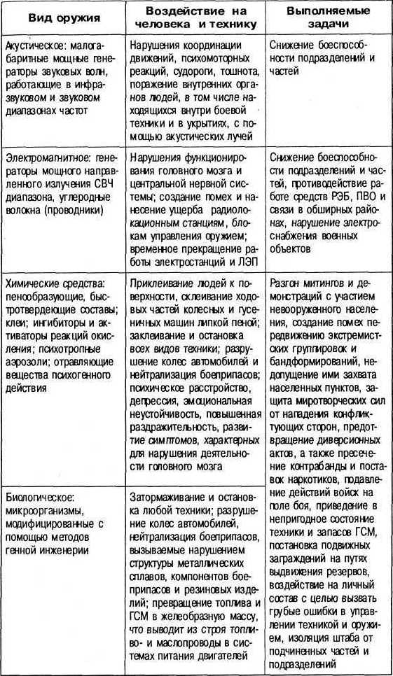 Под понятием «несмертельное оружие» сегодня подразумеваются средства воздействия на людей и технику, созданные на основе химических, биологических, физических и иных принципов, которые делают противника небоеспособным в течение некоторого времени. Предварительные исследования в этой области относятся к 80-м годам, однако в тот период они носили достаточно случайный характер. В начале 90-х годов страны НАТО (США, а затем Великобритания, Германия, Франция и ряд других) приступили к работам, проводившимся на базе отдельных военно-прикладных исследований. Позднее для их координации была сформирована специальная рабочая группа. По утверждению иностранных источников, уже созданы отдельные опытные образцы. В приведенной ниже таблице собраны данные по некоторым видам такого оружия.