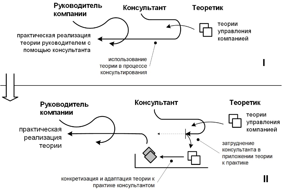 На четвертом уровне профессионального мастерства консультант активно применяет в своей практике теорию управления (4 ступень). (Данный, четвертый уровень можно разбить на подуровни по характеру используемых консультантом теорий, что и будет сделано нами позднее). Важно отметить тот факт, что первые три ступени в профессиональном смысле являются предварительными, и только на четвертом уровне практика консультанта приближается к своей объективной сути. Его миссия состоит в перенесении теории в практику посредством подсказок руководству по совершенствованию процесса управления компанией (см. сх. 7). Другими словами, консультант становится своего рода проводником, посредником между существующими теорией и практикой управления (см. сх. 5).