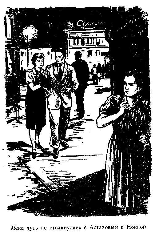 Прошло много времени. Через двадцать минут уходил последний автобус. Лена медленно, опустив голову, пошла вперед и вдруг чуть не столкнулась с Астаховым и Нонной. На Шутовой была прозрачная нейлоновая кофточка с пышным бантом, плиссированная голубая юбка, модная величиной с ладонь шляпка, бог знает как державшаяся на голове, и туфли на таких высоких каблуках, что у Нонны подгибались колени.