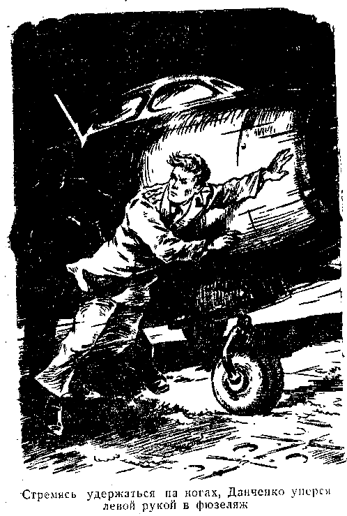 «Пускач», быстро отвалив от хвоста, отъехал в сторону. Пересекая упругую, жаркую струю из выхлопного сопла, Данченко перешел по правую сторону самолета. Ориентиром для него служил огонек сигареты. Но когда он обошел правую плоскость, человек, словно растворившись во тьме, исчез. Сделав еще несколько осторожных шагов вперед, Данченко осмотрелся. Пилот машины, около которой он стоял, дав полные обороты, опробовал двигатель. Данченко показалось, что преследуемый им человек находится по левую сторону машины, что их разделяет только поднятая грудь самолета. Данченко сделал еще несколько шагов вперед, и в это мгновенье кто-то сзади нанес ему сильный удар в спину. Инстинктивно, стремясь удержаться на ногах, Данченко уперся левой рукой в фюзеляж, едва не оказавшись прямо против втяжного сопла самолета. Отбежав в сторону, он дал дорогу самолету, выруливавшему к старту, и оглянулся, но никого не увидел.