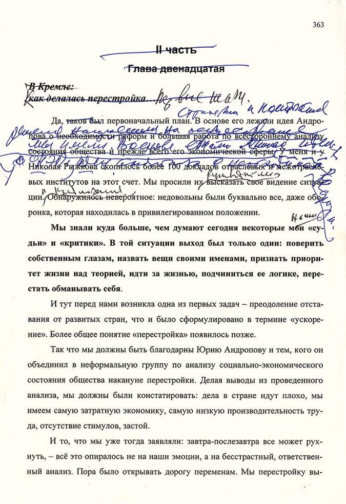 Работая в Международном фонде социально-экономических и политологических исследований им. М.С. Горбачева (Горбачев-Фонде), я с помощью его сотрудников обнаружил множество записей, сделанных Горбачевым и его помощниками от руки, а также машинописных листов с их правкой. Часть из них такие как рукописные наброски Горбачева к пленуму ЦК, обсуждавшему в конце марта 1988 года знаменитый «антиперестроечный манифест» Нины Андреевой (см. главу 14), или неоконченные заметки к статье, работу над которой в Форосе Горбачев был вынужден прервать из-за августовского путча 1991 года (см. главу 28) до сих пор не публиковалась. Почерк у Михаила Сергеевича был торопливый и неразборчивый, но кое-что помогла разобрать его бессменная стенографистка Ирина Вагина.