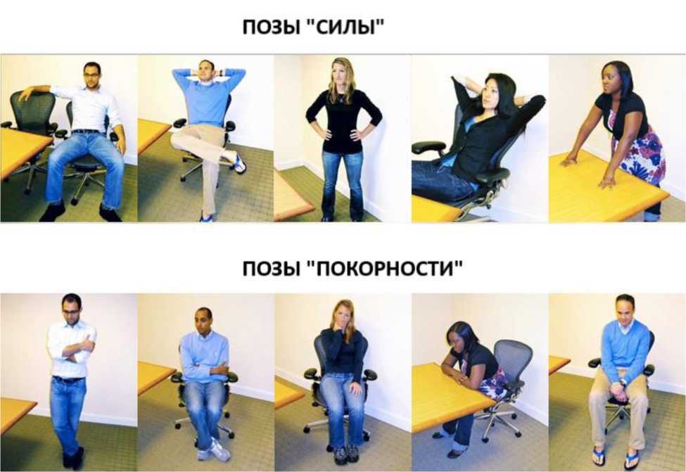 Рекомендации: прямая осанка, высоко поднятая голова, широко расставлены ноги, руки на поясе или подняты вверх, занимать как можно больше места в пространстве.