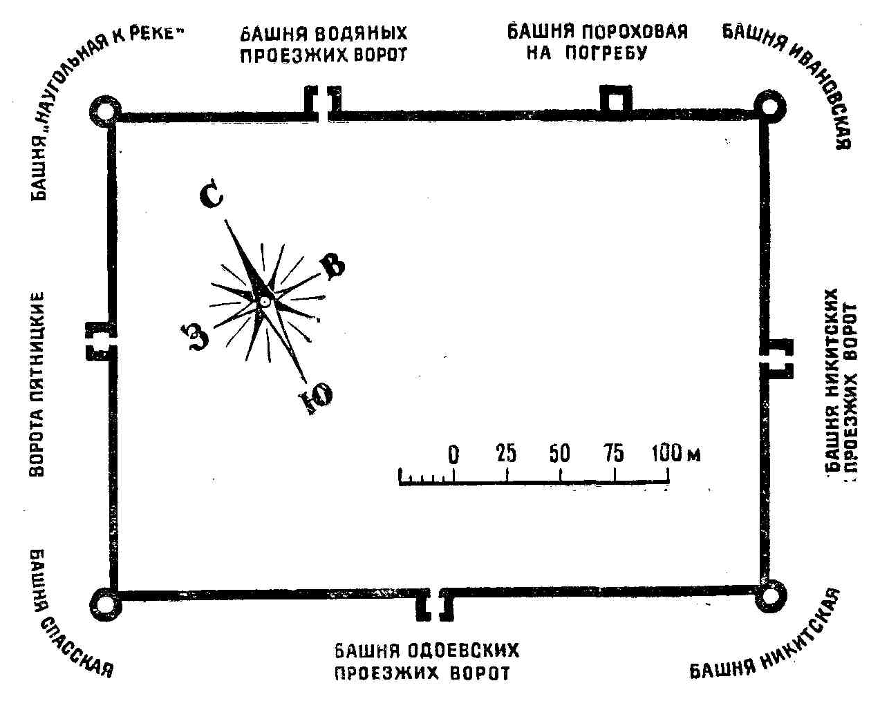 В 1509 г. великий князь Московский Василий III приказал поставить на левом берегу Упы «город на Туле деревян». Город тогда представлял собою дубовую крепость («острог»), охватывавшую почти все поселение (без городища на острове). Ее замкнутый периметр тянулся на протяжении около двух километров по нынешней Советской улице, от ее начала около реки, примерно до проспекта Ленина и следовал далее, примыкая с внутренней стороны к земляному валу до Николо-Завальской церкви (т. е. церкви за валом), откуда поворачивал к реке, следовал вдоль берега на запад и соединялся с началом крепости.