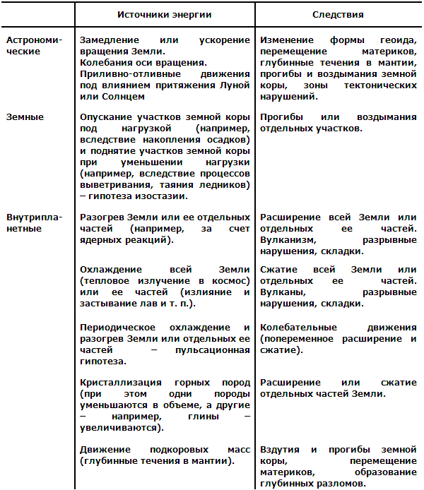 Все перечисленные в таблице источники энергии (и некоторые другие, не указанные) действительно влияют на тектонические движения.