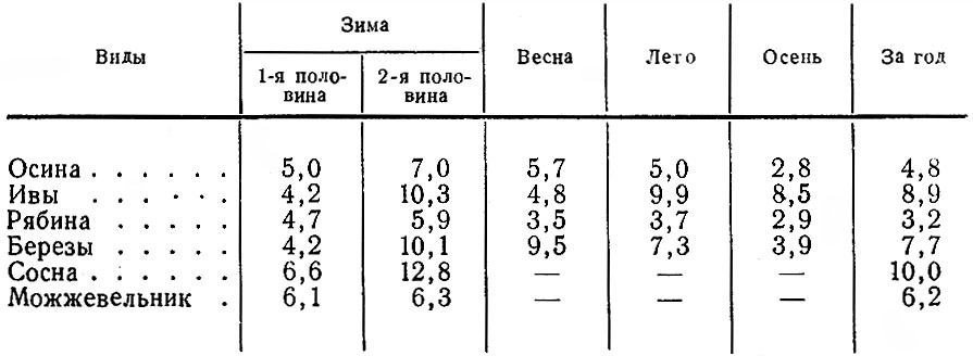 Количество же объедаемых деревьев и кустов заметно сокращается, но не так резко, как, например, на Кольском п-ове, где, по данным О. И. Семенова-Тян-Шанского (1948), лоси в середине зимы объедают за сутки 60-100 деревьев и кустарников, в начале же зимы вдвое больше. У нас этот показатель сокращается с 412 в первой половине зимы до 263 во второй. При этом отдельные животные в ноябре январе съедают за сутки в среднем 1740, а в феврале- апреле 1347 побегов. Интенсивность же повреждения разных пород деревьев и кустарников к середине и концу зимы может возрастать более чем вдвое (табл. 3).