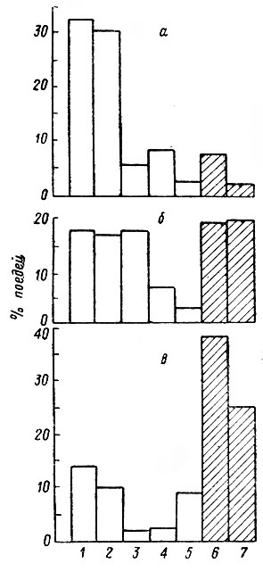 Рис. 3. Роль лиственных и хвойных пород в зимнем питании лося в различных районах Ленинградской области. а Подпорожский район; б Лодейнопольский район; в Лужский район. 1 ивы; 2 осина; 3 березы; 4 рябина; 5 ольха; 6 сосна; 7 можжевельник. Хвойные породы заштрихованы