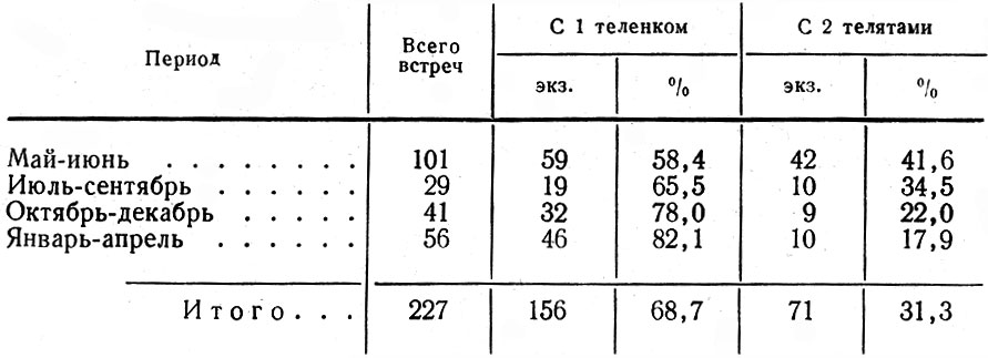 Таблица 9. Встречи коров с одним и двумя телятами по сезонам в 19571968 гг.