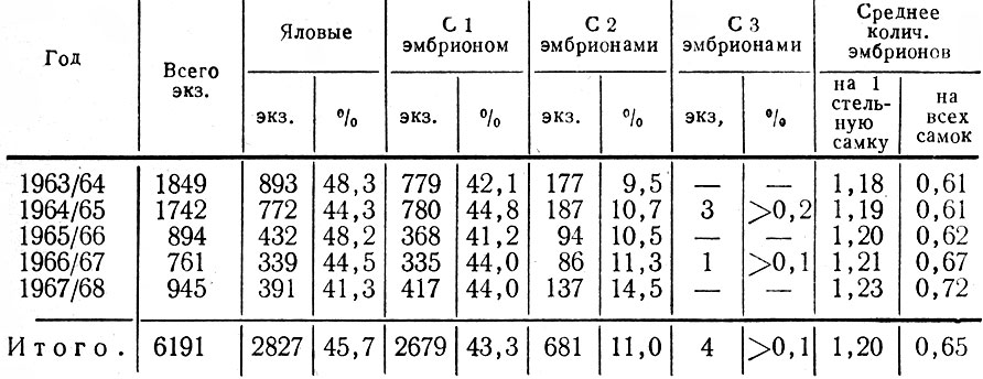 Таблица 10. Плодовитость лосих по данным лицензионного отстрела 1963 1968 гг.