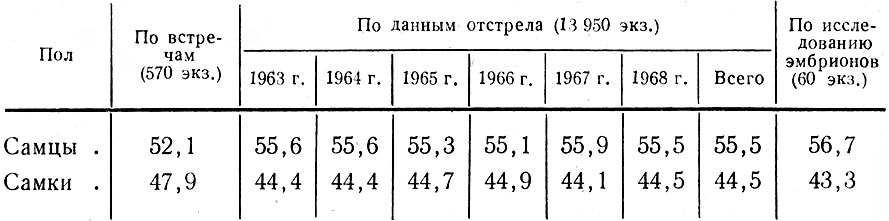 Таблица 18. Соотношение полов (в %) в популяции лося Ленинградской обл., определенное разными методами