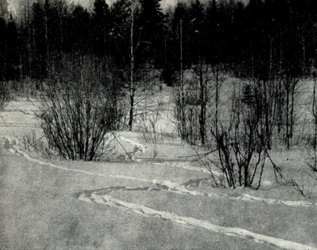 Хорошей иллюстрацией сокращения подвижности лосей к концу зимы могут служить два хронометража, которые мы провели в начале и в конце снежного периода. 16 декабря 1963 г. лосиха, при глубине снега 45 см, делала в среднем 4 шага в минуту и скусывала при этом около 6 побегов. За 1 час она сделала 220 шагов, пройдя 155 м, и съела примерно 390 побегов. 30 марта 1964 г. крупный бык, при глубине снега 57 см, делал в минуту всего 0,9 шага и скусывал также 6 побегов. Движения животного, казалось, были сведены до минимума. Лось объедал все доступные побеги, до которых мог дотянуться с одного места, затем медленно переступал передними ногами и лишь спустя некоторое время задними. За 1 час он сделал только 52 шага, пройдя 36 м, скусил 378 побегов, 2 раза ел снег. Всего бык кормился полтора часа, после чего ушел в ельник и лег рядом с предыдущей лежкой. Таким образом, оба лося кормились с одинаковой интенсивностью, затрачивая в среднем около 10 секунд на поедание одного побега, но второй из них передвигался в четыре раза медленнее, чем первый.