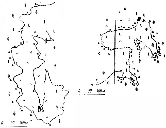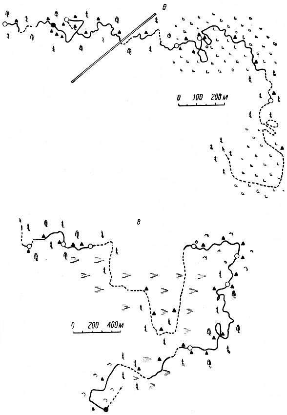 Рис. 16. Схемы пути одиночных взрослых лосей-быков. А 21 января 1963 г., Подпорожский район, Б 4 февраля 1966 г., Лодейнопольский район. Усл. обозн. см. рис. 15