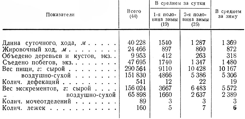 Об однообразном характере деятельности лосей в снежный период наглядно свидетельствуют результаты 44 троплении (табл. 23). О том, насколько велики могут быть индивидуальные отклонения этих показателей от средних у лосей разного пола и возраста, мы можем судить по далным табл. 24 и рисункам 16, 17. Все эти материалы говорят о том, что характер деятельности лосей зимой в основном определяется состоянием кормовой базы и снежного покрова. Значительное уменьшение питательности корма, увеличение глубины снега и сильные морозы вынуждают животных экономить
