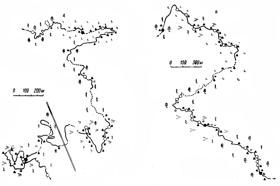 Pиc. 17. Схемы пути одиночных молодых лосей, Подпорожский район. А 1416 марта 1963 г., Б 2425 марта 1964 г. Усл. обози. см. рис. 15