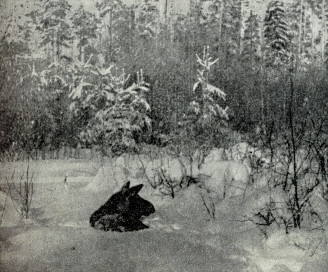 Рис. XXI. Молодой лось на лежке в глубоком снегу. Фото Ю.Б. Пукинского