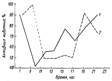 Рис. 18. Различия суточной активности лося в бесснежный (/) и снежный (2) периоды года