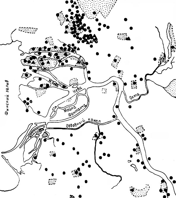 Рис, 19. Схема заходов лосей в пределы Петербурга Ленинграда (по Г. А. Новикову и П. Д. Иванову, 1970). 1 18701896 гг.; 2 19551970 гг.; 3 зеленые насаждения