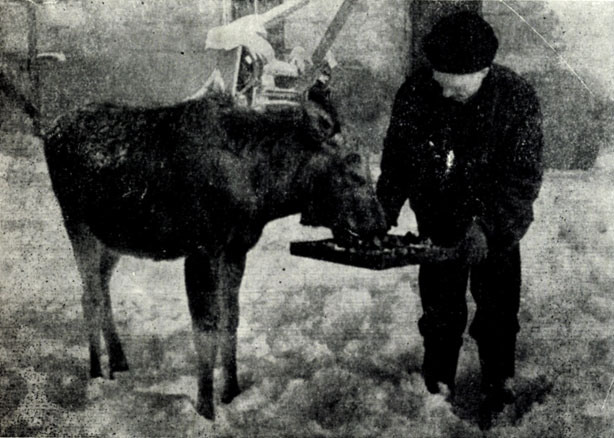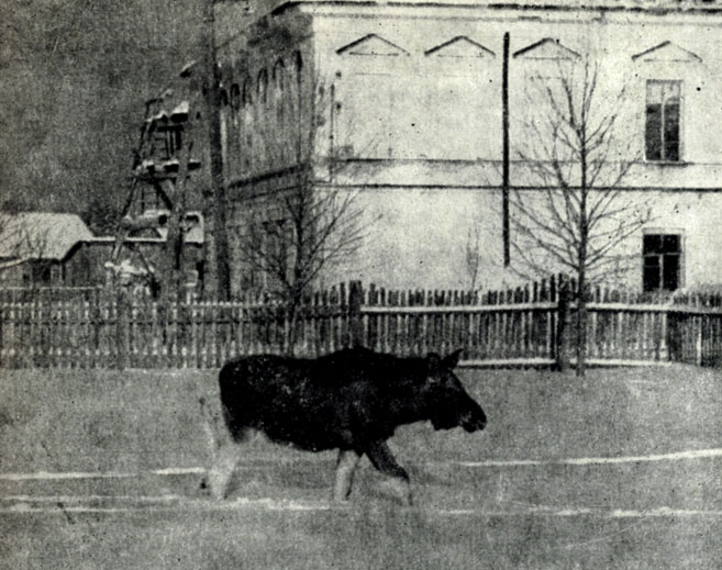 Рис. XXV. Молодой дикий лось около столовой поселка Лисино-Корпус. Фото Ю.Б. Пукинского