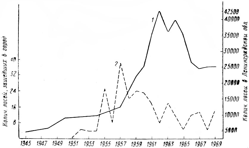 Рис. 20. Связь количества заходов лосей в Ленинград с численностью их в области. 1 численность лосей; 2 количество лосей, зашедших в город