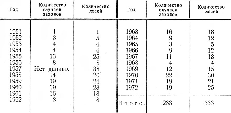 *(Сведения о заходах лосей в 19511963 гг., почерпнутые в материалах Ленинградского утилизационного завода и из некоторых других источников, принадлежат И. И. Соколову; в 19701972 гг. П. Д. Иванову.)