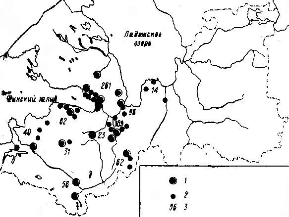 Рис. 21. Места и результаты лосиных охот в Петербургской губернии в 18731914 гг. 1 основные; 2 второстепенные, 3 общее количество добытых лосей