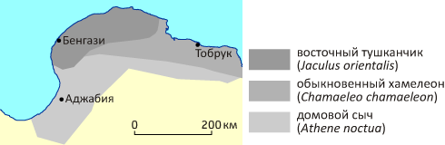 Рис. 8. Современные ареалы распространения в Киренаике животных с монеты Барки .