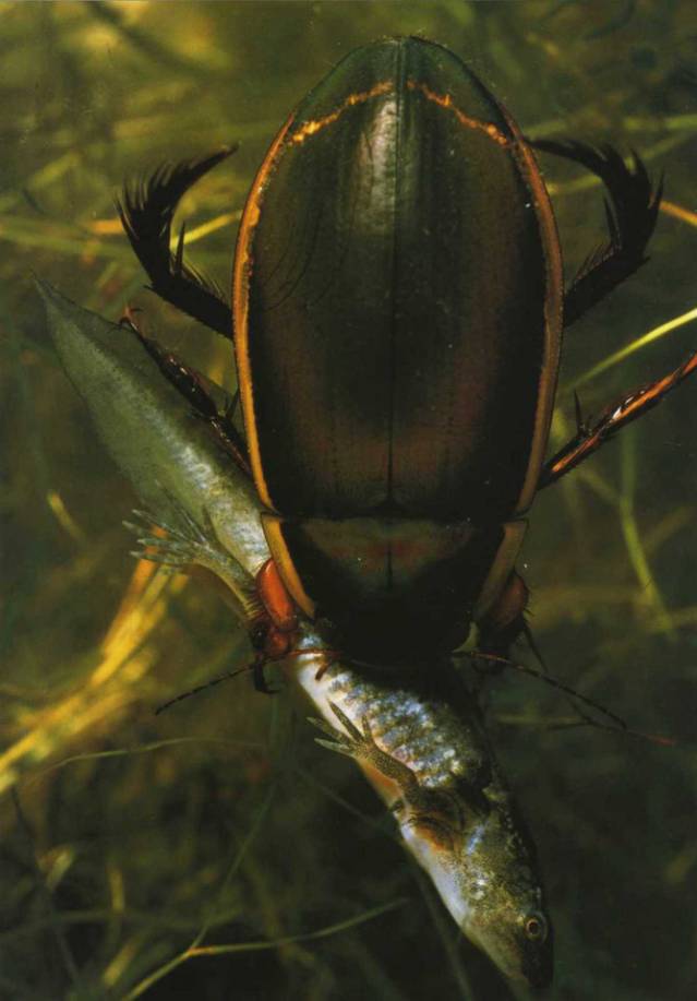 Гигантский водяной жук хищник-прожора. Он может справиться с любым противником размером с него самого, а иногда даже и больше. Этот жук собирается поглотить личинку саламандры, помогая себе плотно захватывающими передними клешнями и острыми челюстями.