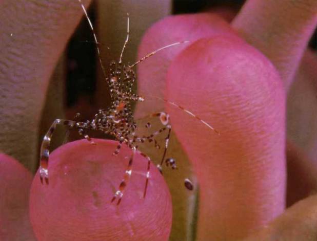 Розовые и темно-бордовые цвета этой креветки точно соответствуют оттенкам морской анемоны, произрастающей на рифах у Багамских островов.
