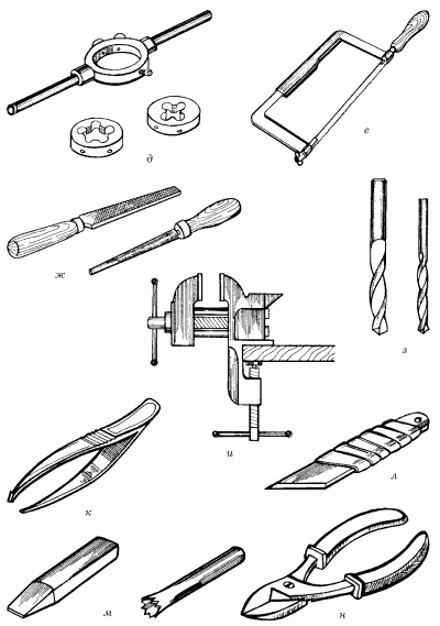 Рис. 1 (продолжение): д плашка с плашкодержателем; е ножовка по металлу; ж напильники; з набор сверл; и небольшие тиски; к пинцет; л монтажный нож; м зубило и шлямбур; н бокорезы с изолированными ручками.