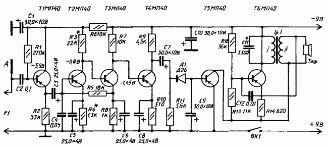 Для питания устройства осуществляют последовательное соединение батарей 3336Л (их суммарный ток 58 мА). Проводник с током в антенне А наводит в приборе напряжение частотой 50 Гц, которое увеличивается усилителем звуковой частоты (собранным на транзисторах Т1 Т4). Далее напряжение выпрямляется диодом Д1 (его значение на выходе 0,20,4 В) и поступает на базу транзистора Т5 ключевого каскада. Под действием напряжения блокинг-генератор, собранный на транзисторе Т6, начинает