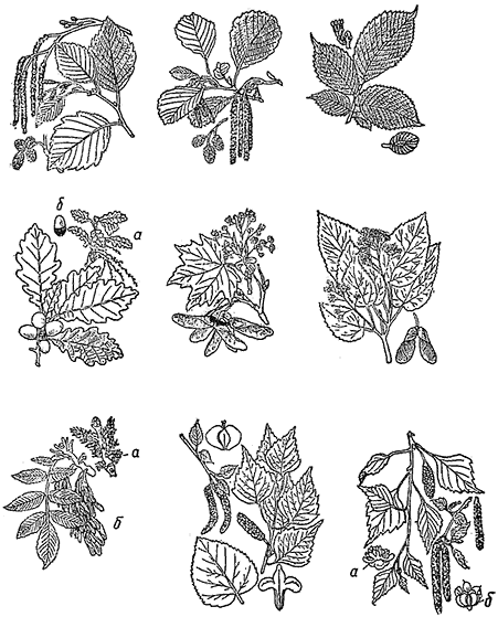 верхний ряд (слева направо): ольха серая; ольха черная, или клейкая, вяз шершавый, или ильм, и его цветок и плод; средний ряд: дуб обыкновенный (а цветущая ветка; б плод, желудь); клен остролистный; клен татарский; нижний ряд: ясень обыкновенный (а цветущая ветка; б плоды); береза пушистая; береза бородавчатая (а мужской цветок; б женский цветок)