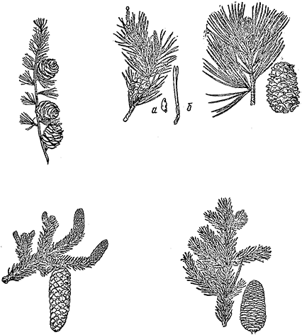 Вверху (слева направо): лиственница сибирская с шишками; сосна обыкновенная (а семя с крылом; б молодая хвоя); сосна сибирская, или кедр, и его шишка; внизу: ель обыкновенная с шишкой; пихта сибирская и ее шишка