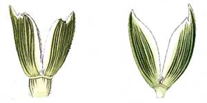 Рис. 23. Колосковые чешуи спельты (слева) и полбы (справа) на ботанических иллюстрациях (из Host, 1805).