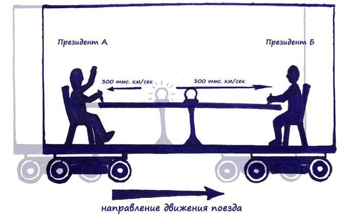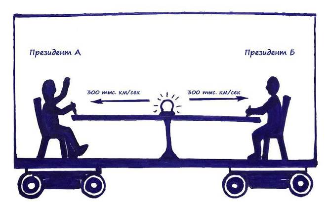 Президент страны А глядит вперед по ходу движения состава, а президент страны Б сидит спиной к направлению движения поезда. Итак, лампочка загорелась, свет со своей постоянной скоростью 300 000 км/сек полетел в разные стороны (напомню предыдущую лекцию, где мы говорили о том, что в системе отсчета президентов вагон покоится на месте, скорость света не складывается со скоростью поезда), и в итоге свет достиг глаз президентов ОДНОВРЕМЕННО стороны подписали мирный договор.