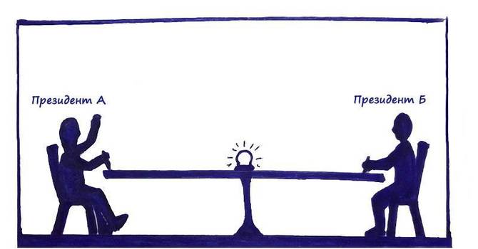 Так как оба президента оказались слишком гордые, и никто не хотел подписывать договор первым, хитрые юристы придумали план: оба президента садятся за длинный стол в вагоне поезда. Ровно посреди стола стоит сигнальная лампа. Президенты сидят и смотрят на лампу, и как только она загорается, оба президента ставят на экземплярах договора свои подписи. Казалось бы, что может пойти не так?