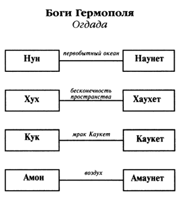 В Гермополе (рис. 20) четыре пары богов участвовали в акте творения: Нун и Наунет (первобытный океан), Хух и Хаухет (бесконечность пространства), Кук и Каукет (мрак), Амон и Амаунет (воздух или невидимое).