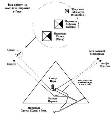 не случайно; штольня, ведущая из Камеры Царицы, точно указывает на Бету Большой Медведицы, которая в египетской мифологии ассоциировалась с космическим возрождением и бессмертием души, в то время как северная штольня, проложенная из Камеры Царя, указывает на Альфу Дракона из созвездия Дракона, ассоциировавшегося с плодородием.