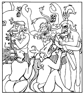 к юго-востоку от Паленке, в окрестностях Бонампака, обнаружил в джунглях храм. Его стены и потолок покрывали фрески с изображением батальных сцен и другие странные картины, присыпанные известняковой крошкой. Именно они начиная с 1946 года убедили археологов в том, будто бы майя были кровожадными и воинственными. Но, применив ту же технику дешифрирования, что и раньше, всего лишь к части фресок, мы увидим, что они тоже содержат множество скрытых картин (на вкладке 3 изображена одна из них).