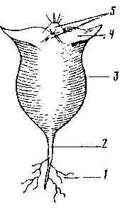 1 боковые корни; 2 главный корень; 3 гипокотиль; 4 семядоли; 5 первые два сосочка на развивающемся стебле.