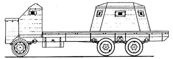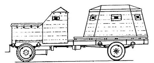 К первой группе относятся машины семейства Armadillo, выпускавшиеся заводом фирмы London, Midland and Scottish Railway в Волвертоне. На платформе грузового автомобиля монтировался деревянный короб размерами 1780x1625x1370 мм. Внутрь него вставлялся второй, при этом зазор между их стенками составлял 6 дюймов (152 мм). Это пространство заполнялось галькой, щебнем или мелким булыжником. Такая конструкция могла выдерживать пулеметный огонь с близких дистанций. В стенках короба имелись бойницы, закрываемые стальными заслонками, а сверху устройство для установки пулемета Lewis. Стекла кабины грузовика защищались листами котельного железа. Было изготовлено 312 таких машин, получивших название Armadillo Mk I. В отличие от них 295 Armadillo Mk II, изготовленных на базе 3-тонного грузовика Bedford, имели удлиненный короб и защиту радиатора и бензобака. На 55 экземплярах Armadillo Mk III в задней части укороченного (по сравнению с Mk II) короба устанавливалась 1,5-фунтовая пушка.