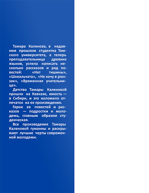 Как и всем настоящим писателям, Тамаре Каленовой предстоит нелегкая дорога. Особенно трудно ей будет с годами сохранить светлую, радужную манеру письма, более свойственную молодости, чем умудренной мыслями и переживаниями зрелости.