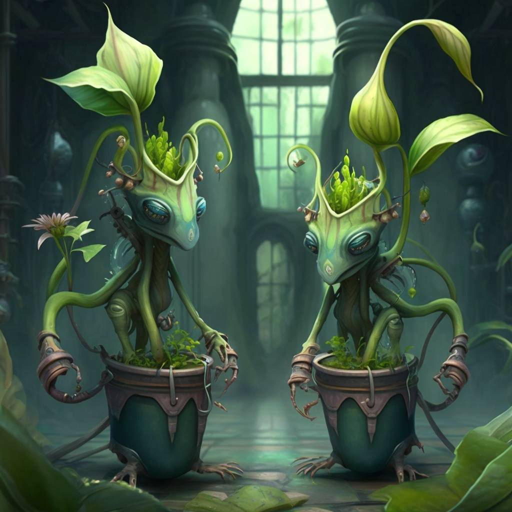 Побродив по тропинкам среди высоких деревьев и кустарников, с разноцветными широкими листьями мы заходим в маленький закуток, в котором через небольшие затемнённые окна едва проходит свет. Драцен хлопает в ладоши и над столом загорается световой шарик, выдёргивая из темноты два горшочка со спящими в нём растениями.