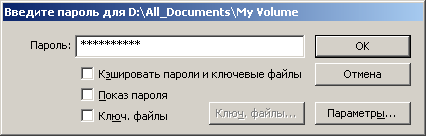 Обратите внимание: Когда вы открываете файлы, хранимые на томе TrueCrypt (или когда вы записываете/копируете файлы), вам не надо вводить пароль каждый раз. Достаточно один раз ввести правильный пароль при подключении тома.