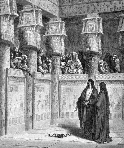 Снова пошли они к фараону, и бросил Аарон свой посох перед фараоном и его приближенными. Посох сделался змеем. Египетские волхвы тут же побросали свои палки на землю, и их палки тоже сделались змеями, но змей Моисея пожрал всех змей волхвов фараоновых.