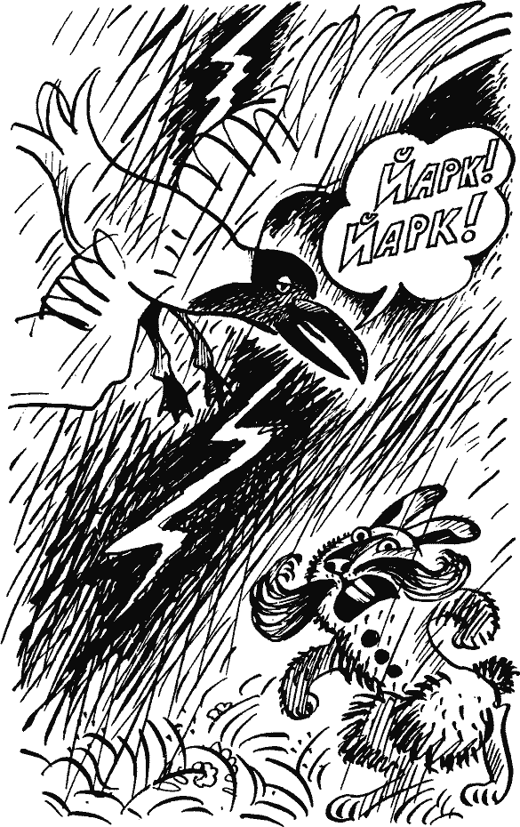 глубокими лужами, было невозможно разобрать дорогу. Кролики брели вслепую, натыкаясь то здесь, то там на заблудившихся товарищей. Кихар слетал к реке и обратно и проделал этот рейс многократно, помогая Лохмачу отыскать потерявшихся крольчих.