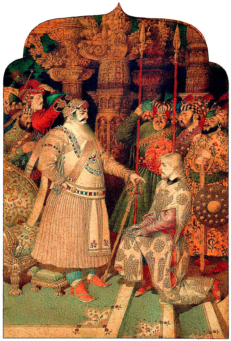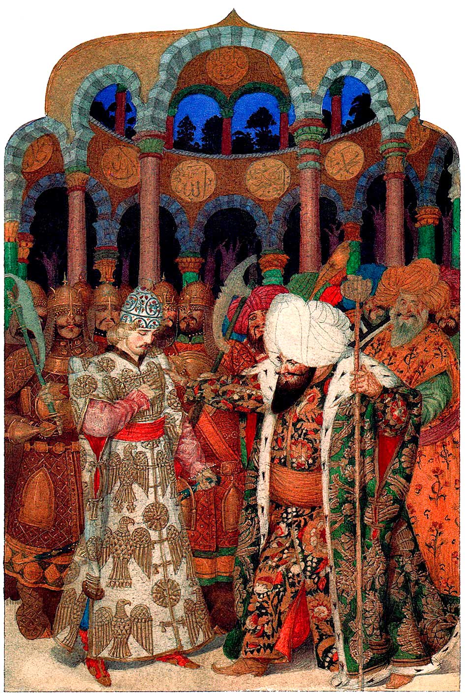 Иван-царевич клетку отомкнул, Жар-птицу за пазуху сунул. Но так ему клетка приглянулась, что он не удержался и схватил её. В тот же миг загремело-загудело по всему саду. Примчались стражники, схватили, скрутили Ивана-царевича и привели пред очи повелителя той страны, Султана заморского.