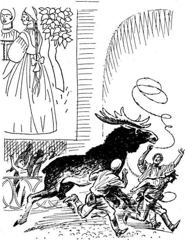 В сквере важно расхаживал красавец лось, а вокруг него беспомощно бегали два милиционера с веревками. Лось чувствовал себя довольно спокойно. С гордым видом шествовал он вокруг клумбы, останавливался, срывал верхней губой несколько цветков и вновь отправлялся в «кругосветное путешествие».